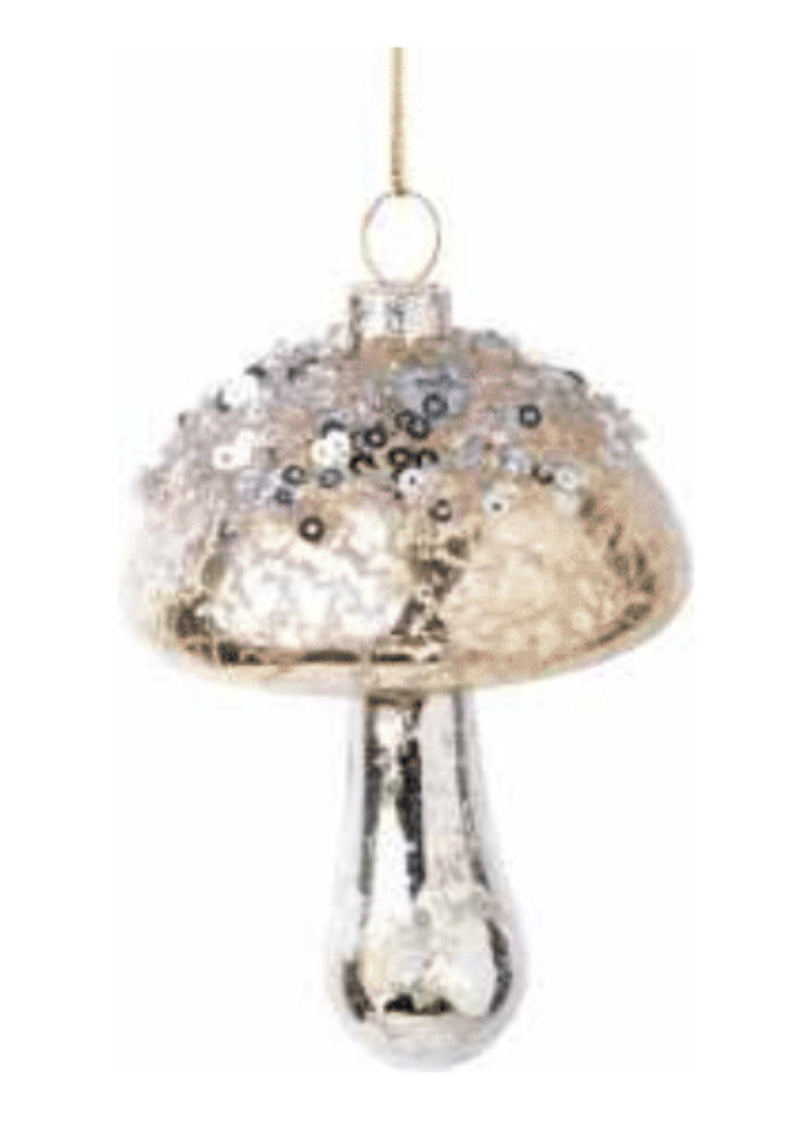 Blown glass mushroom ornament pale shiny silver with bead and glitter top