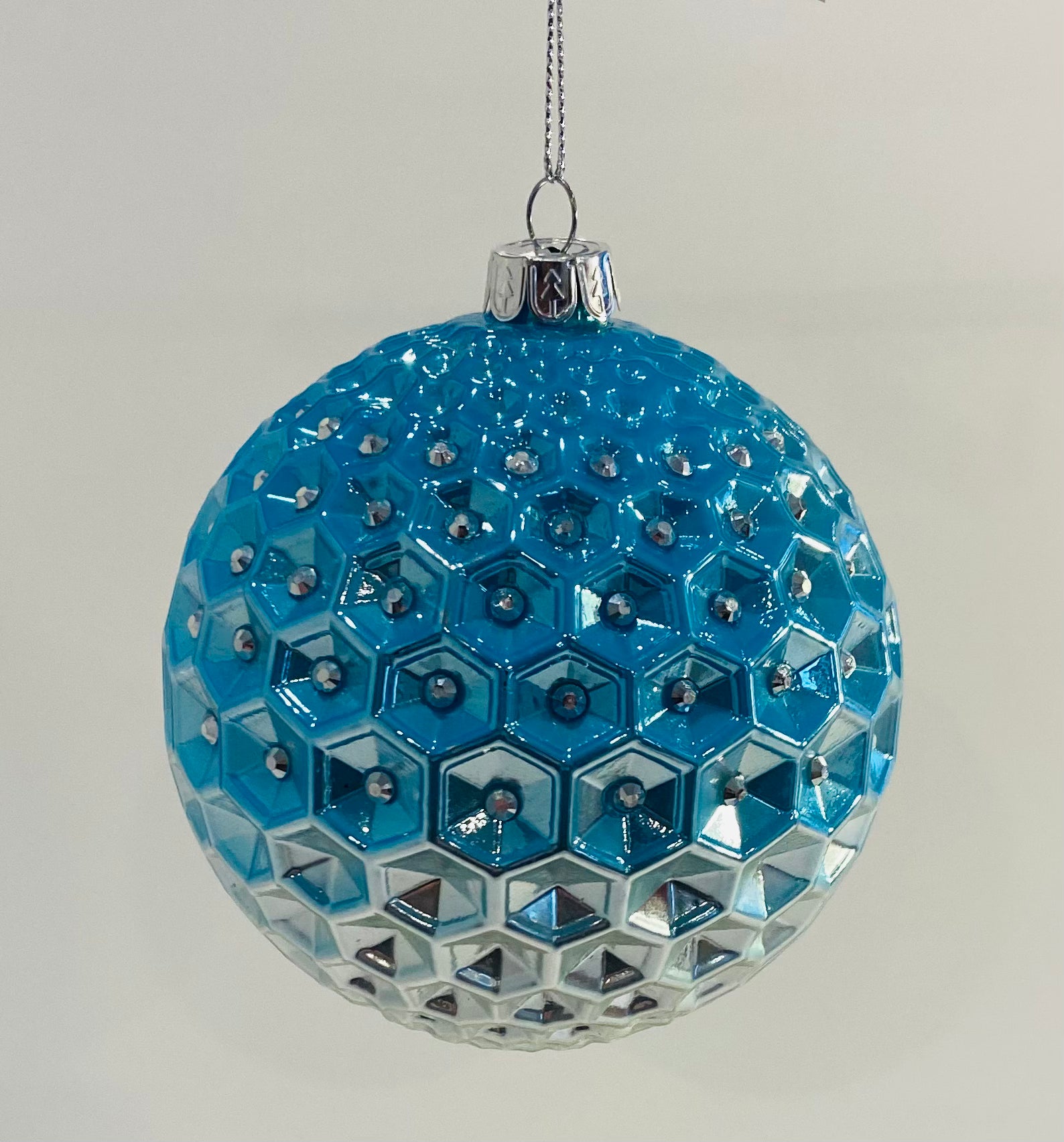 Light capturing lighter blue Christmas ball. Ombre colouring.